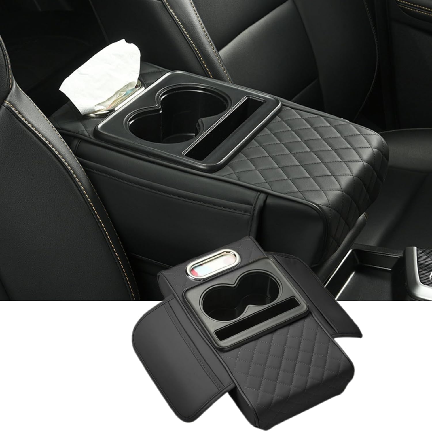 🔔 Multi-functional design: car console cover is multi-functional, tissue bag (6.3*2.7*2.7inch), two side pockets (9.65*3.34inch), 2 cup holders (2.8inch diameter each), and also gives you a place to relax your arms.